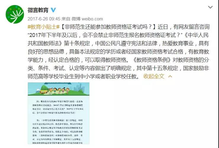 而在更早的2017年,教育部新闻办公室官方微博就明确表示:国家鼓励非师范高等学校毕业生到中小学或者职业学校任教。根据《中华人民共和国教师法》明确规定,中国公民凡遵守宪法和法律,热爱教育事业,具有良好的思想品德,具备本法规定的学历或者经国家教师资格考试合格,有教育教学能力,经认定合格的,可以取得教师资格。所以,有志教书育人的同学们,放心报名吧!