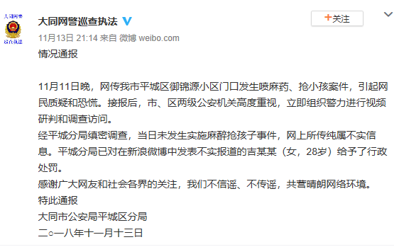 11月11日晚间,网传山西省大同市平城区御锦源小区门口发生“喷麻药”、“抢小孩”案件,引起网民关注,13日下午,大同市公安局平城区分局发布情况通报称:经平城分局缜密调查,当日未发生实施麻醉抢孩子事件,网上所传纯属不实信息,已对不实报道的吉某某(女,28岁)给予了行政处罚。