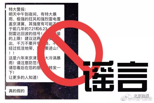 6月28日,网上有传言称“今天京津冀特大暴雨”内容说得有模有样:29日中午到夜间,有特大暴雨、极强的狂风和强烈雷电覆盖京津冀,其强度有可能不亚于前几年的7.21和6.23。