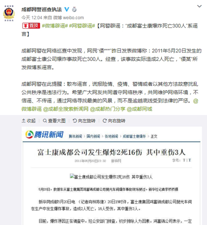9月9日,成都网警巡查执法官方微博发出通报:成都网警在网络巡查中发现,网民“倭***”8日发表微博称:2011年5月20日发生的成都富士康公司爆炸事故死亡300人。经查,该事故实际造成2人死亡,“倭某”所发微博系谣言。
