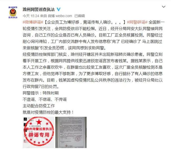 经疫情防控指挥部门核实,滁州经开辖区并未出现新冠肺炎确诊患者。网警立刻着手开展工作,根据网民提供线索迅速锁定谣言发布者钱某。据钱某表示,自己本人工作之余喜欢吹牛,在群里也比较受工友喜欢,这次厂里全员核酸检测本是方便工友,但他觉得不够刺激,为了更多博取好感,自行脑补了有人确诊的信息发布在群内。目前,钱某因虚构疫情扰乱公共秩序的违法行为,被经开分局处以行政拘留7日的处罚。