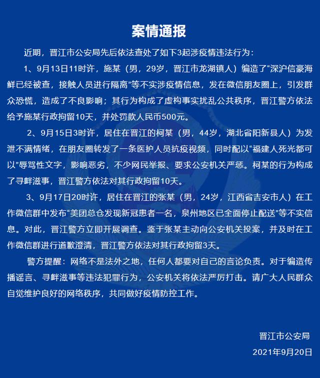 9月20日,晋江市公安局发布《案情通报》进行辟谣,网传消息为不实信息。