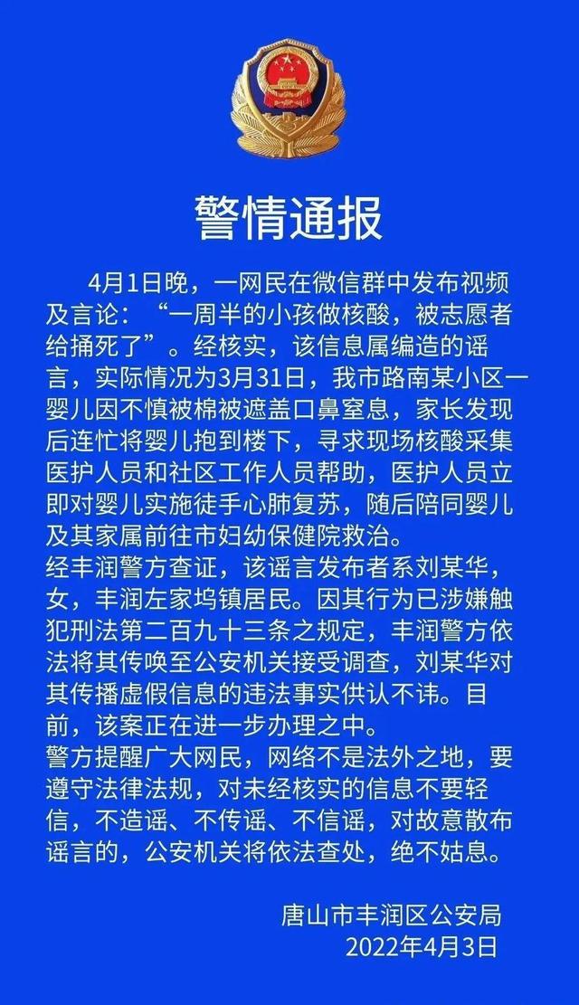 河北省唐山市丰润区公安局日前发布《警情通报》称,4月1日晚,一网民在微信群中发布视频及言论:“一周半的小孩做核酸,被志愿者给捅死了”。经核实,该信息属编造的谣言,实际情况为3月31日,唐山市路南某小区一婴儿因不慎被棉被遮盖口鼻窒息,家长发现后连忙将婴儿抱到楼下,寻求现场核酸采集医护人员和社区工作人员帮助,医护人员立即对婴儿实施徒手心肺复苏,随后陪同婴儿及其家属前往市妇幼保健院救治。