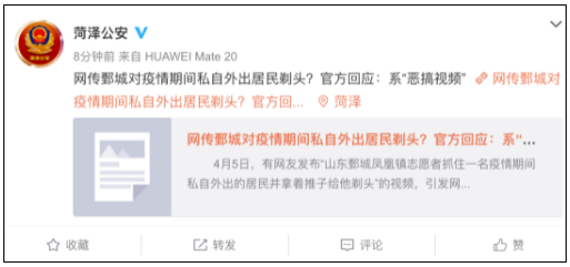 鄄城县公安局凤凰镇派出所所长刘传举表示,经调查,平时侯某省、侯某国、侯某博、王某4人经常在一起玩,关系比较密切,其中侯某省平时也经常拍摄短视频发布到抖音平台,于是4名青年共同商讨拍摄了该视频。但是,这样的“恶搞视频”扰乱了正常的防疫秩序,在网上混淆视听,目前,警方已对视频摄制者进行了批评教育。