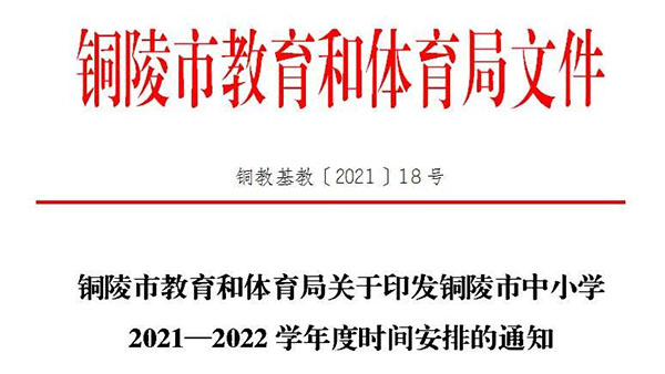 铜陵市中小学校暑假放假时间严格按照2021年7月28日印发的《铜陵市教育和体育局关于印发铜陵市中小学2021—2022学年度时间安排的通知》执行,并未作调整,具体时间安排如下。