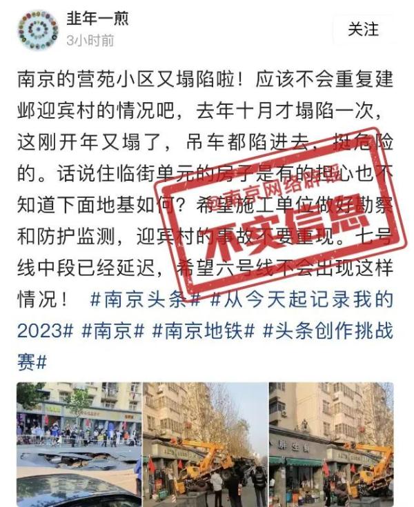 1月7日,网上流传一则消息,内容提到“南京的营苑小区又塌陷啦!应该不会重复建邺迎宾村的情况吧,吊车都陷进去,挺危险的。”相关消息引起一些网民的关注和担忧。