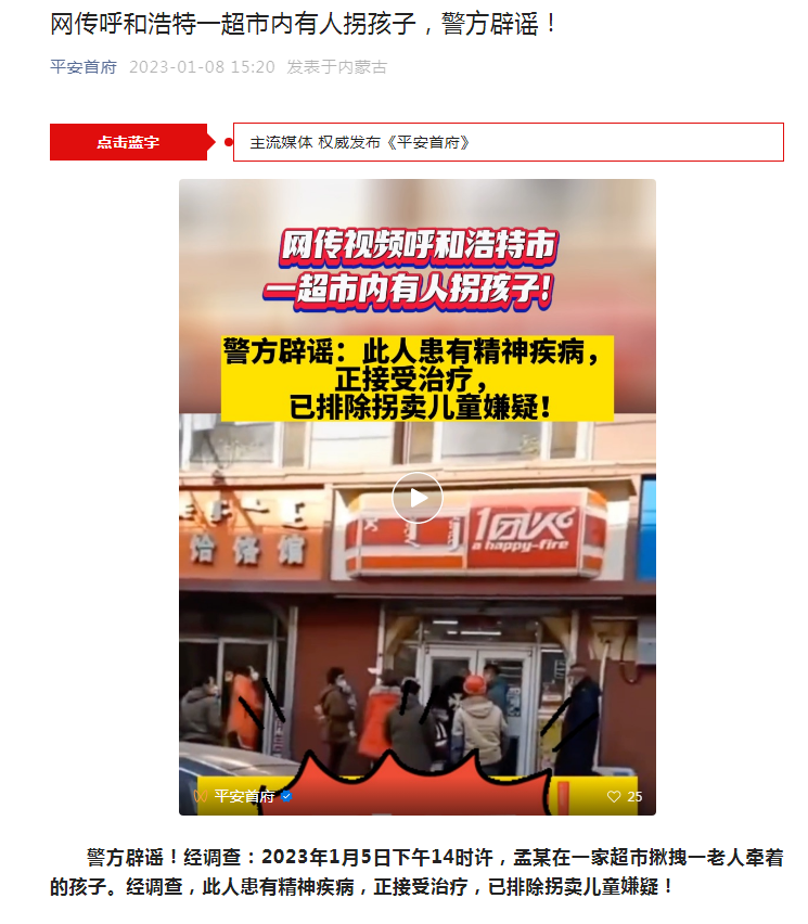 警方辟谣!经调查:2023年1月5日下午14时许,孟某在一家超市揪拽一老人牵着的孩子。经调查,此人患有精神疾病,正接受治疗,已排除拐卖儿童嫌疑!