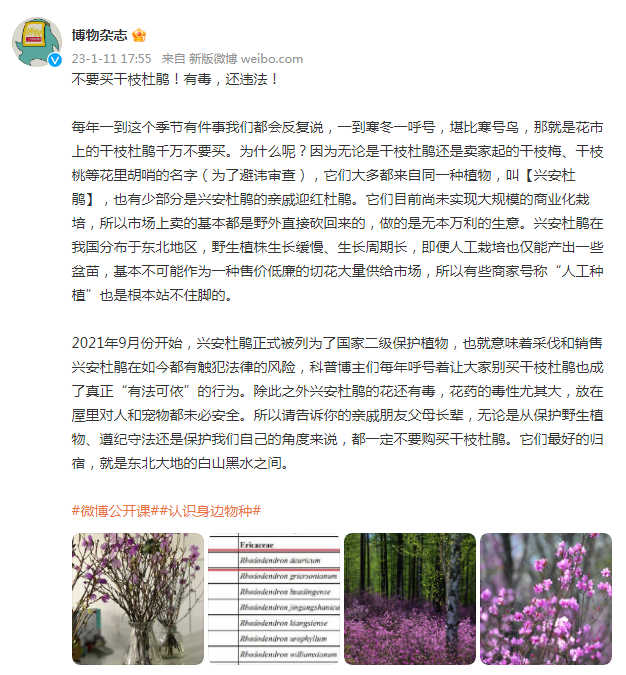 近日,一知名科普博主@博物杂志 就发微博提醒:不要买干枝杜鹃!有毒,还违法!