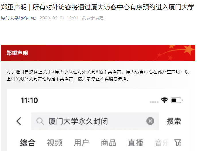 对此,2月1日,厦门大学官方发布声明,表示网传消息为不实谣言,所有对外访客都可通过厦大访客中心有序预约进入厦门大学,呼吁网民停止不实消息传播。