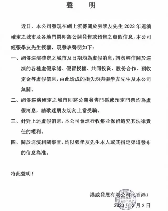 2月3日,张学友公司发布声明,称网传“张学友2023年巡演确定之城市及各地门票即将公开发售”为虚假消息,请歌迷朋友切勿上当受骗。