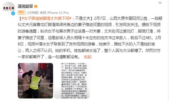 2月7日,山西太原市晋阳河公园,一段疑似丈夫元宵看花灯脚滑摔误将身边的妻子推进河里的视频,引发网友关注。据拍下视频的游客透露:粉衣女子与黑衣男子应该是一对夫妻,丈夫在河边赏花灯,脚底打滑,将妻子推进了河里,但是安保人员从相隔十米左右的地方冲过来救人,前后不过4秒。