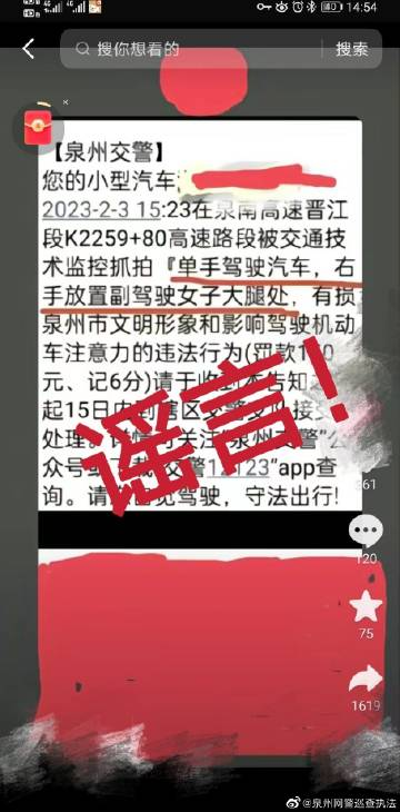 这条短信内容是以“泉州交警”的名义发布,内容显示某车主因“单手驾驶汽车,右手放置副驾驶女子大腿处,有损泉州市文明形象和影响驾驶机动车注意力的违法行为”为由被交警监控抓拍并处罚。