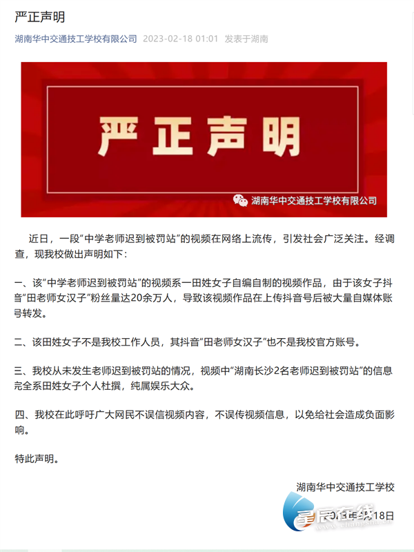 2月18日,涉事学校做出声明,称“田老师女汉子”非该校工作人员,其抖音也不是该校官方账号。该校还称,该校从未发生老师迟到被罚站的情况,视频中“湖南长沙2名老师迟到被罚站”的信息完全系作者个人杜撰,纯属娱乐大众。