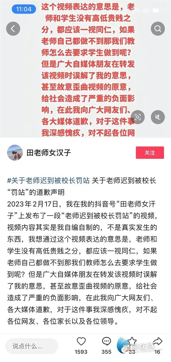 (网传“中学老师迟到被罚站”视频创作者“田老师女汉子”的道歉声明。)