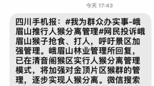 近日,一条名为“峨眉山的猴子,你们的好日子到头了”的网帖引发网友关注。截图中称,峨眉山将推行“人猴分离”管理。