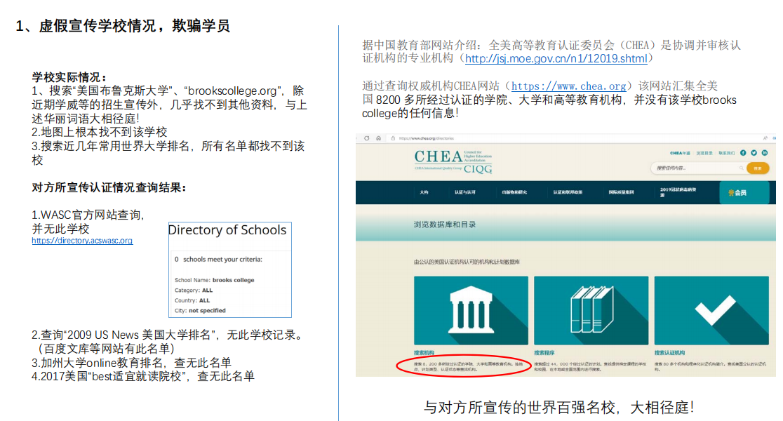 另一位学员整理的证据显示,“地图上根本找不到该学校”“搜索近几年常用世界大学排名,所有名单都找不到该校。”这名学员表示,自己还询问了在美国留学或工作的朋友,均没有听说过学威所宣传的美国布鲁克斯大学。其直斥,当初学威宣传美国布鲁克斯大学是“世界知名名校”,涉嫌虚假宣传。此外,还有学员表示,学威推荐的名为“美国菲利普斯研究大学”“美国商业学院”的学校,同样存在“野鸡院校”的嫌疑。