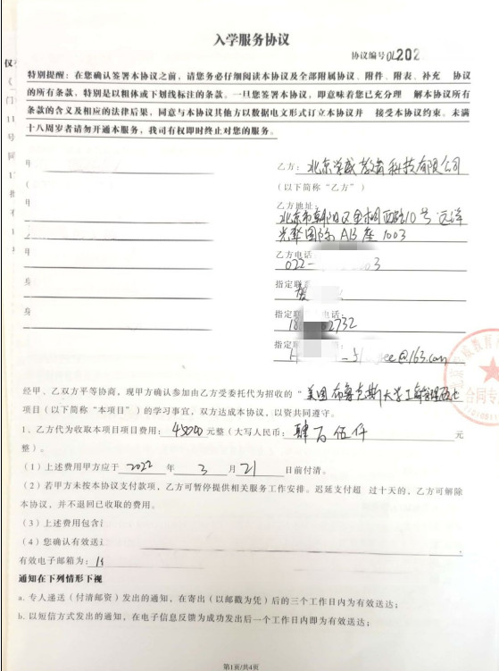 罗晓翠与学威北京签下的美国布鲁克斯大学入学协议