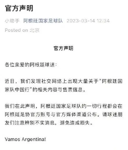 阿根廷国家足球队发布声明:近日,我们发现社交网络上出现大量关于“阿根廷国家队中国行”的相关内容与售票信息。