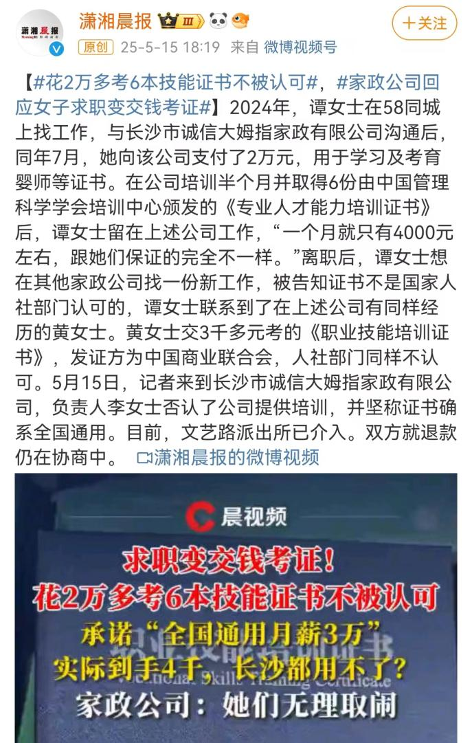 谭女士支付2万元,在公司培训半个月取得了6份培训证书。因公司承诺的薪资与实际支付的不符,谭女士选择离职。在后续找工作的过程中,谭女士被告知自己的证书不是国家人社部门认可的……