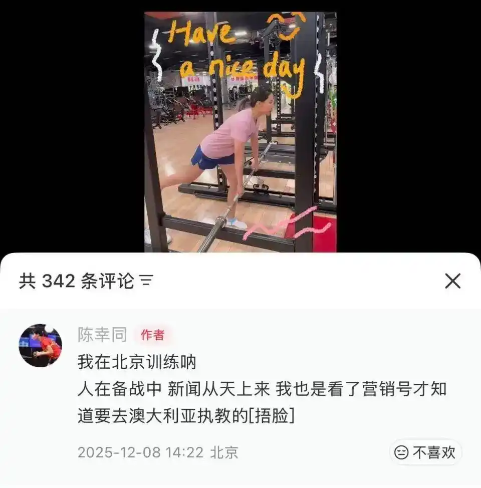 12月8日,中国乒乓球队队员陈幸同在社交平台辟谣赴澳大利亚执教传闻。她表示自己正在北京训练,“人在备战中,新闻从天上来。我也是看了营销号才知道要去澳大利亚执教的。”