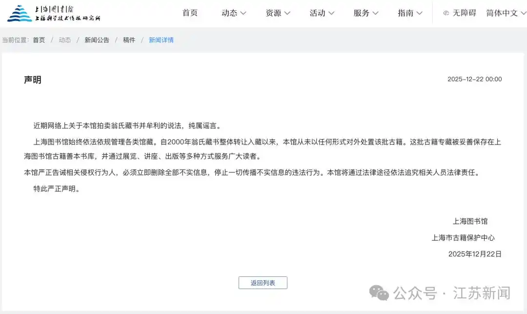 据上海图书馆网站消息,上海图书馆、上海市古籍保护中心12月22日发布声明: