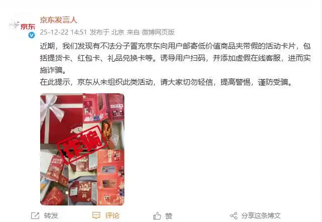 【京东提醒:近期有不法分子冒名邮寄虚假活动卡片实施诈骗】“京东发言人”微博发文称,近期发现有不法分子冒充京东向用户邮寄低价值商品夹带假的活动卡片,包括提货卡、红包卡、礼品兑换卡等。诱导用户扫码,并添加虚假在线客服,进而实施诈骗。在此提示,京东从未组织此类活动,请大家切勿轻信,提高警惕,谨防受骗。