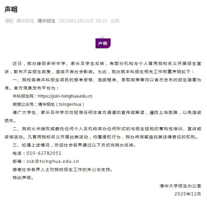 中新网12月24日电 据“清华招生”微信公众号消息,清华大学招生办公室24日发布声明称,近日,清华大学招生办公室接到多所中学、家长及学生反映,有部分机构与个人冒用清华大学名义开展招生宣讲,散布不实招生政策,造成不良社会影响。为此,清华大学招生办公室就本科招生相关工作郑重声明如下: