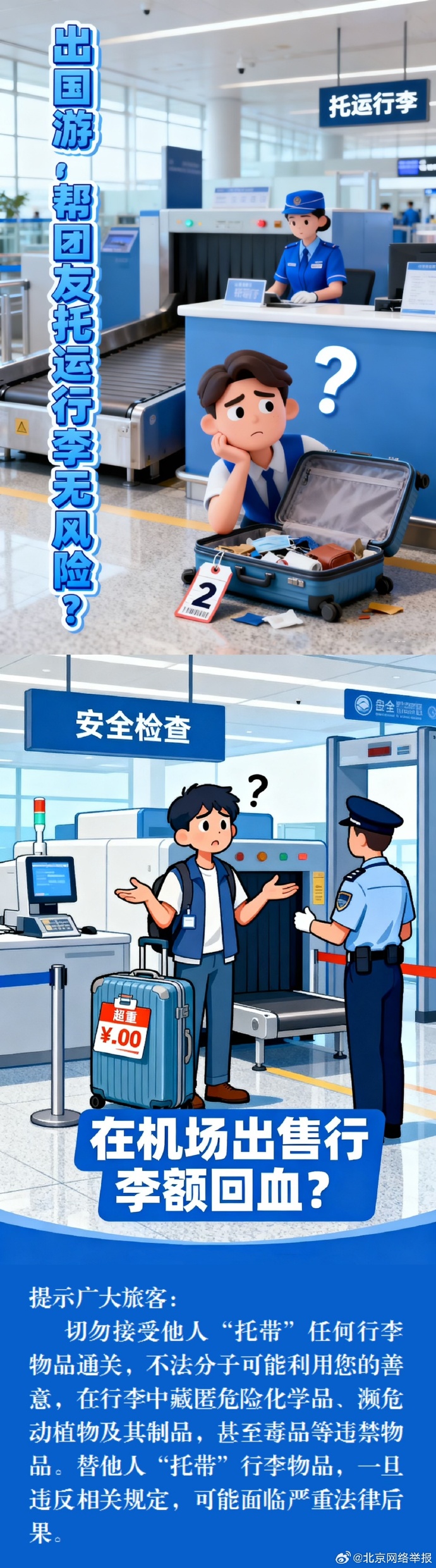 出境游已成为许多人假期休闲的热门选择。出行中,不少人认为“出国游,帮团友托运行李无风险”“可在机场出售行李额回血”,事实真的如此吗?警惕!不法分子可能利用您的善意,在行李中藏匿危险化学品、濒危动植物及其制品,甚至毒品等违禁物品。替他人“拖带”行李物品,一旦违法相关规定,可能面临严重法律后果。(作者:王法凯 推荐单位:北京海关)