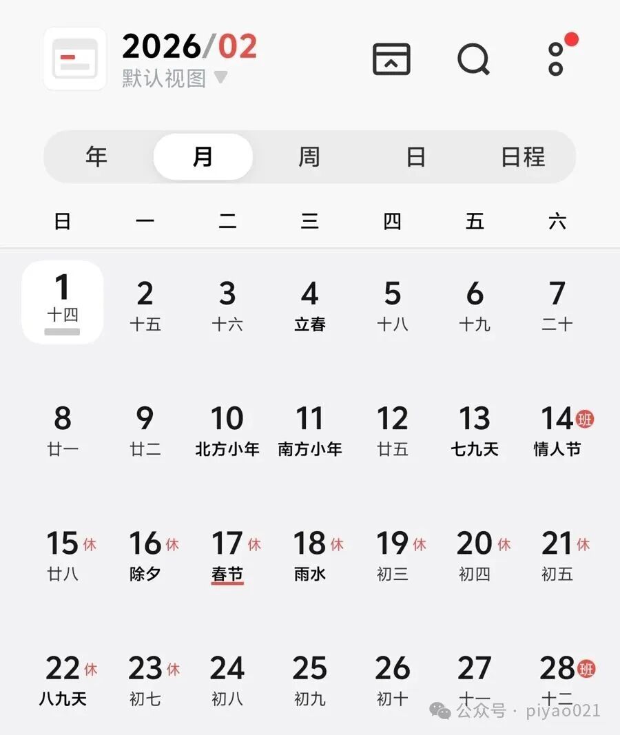 某手机自带日历显示的2026年2月(截屏)