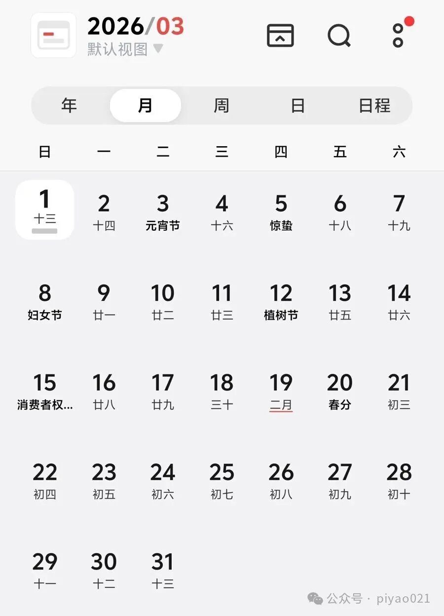 今年3月有5个周日、周一、周二(手机截屏)