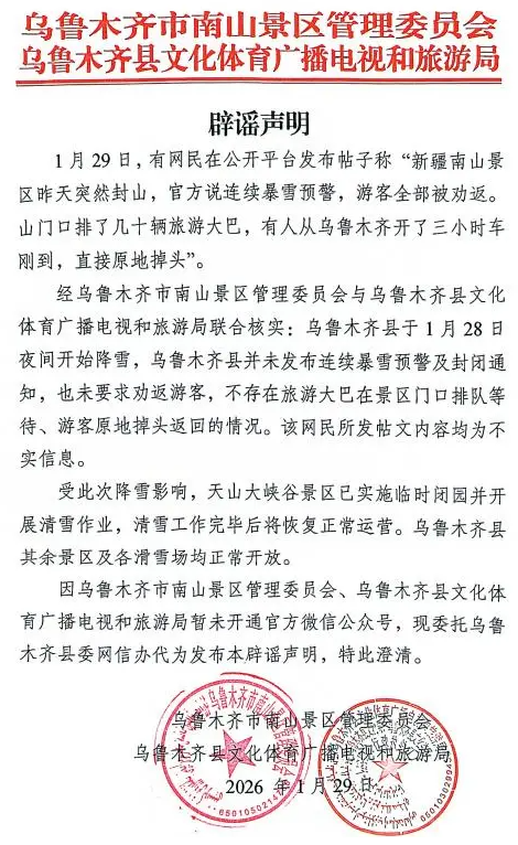经乌鲁木齐市南山景区管理委员会、县文化体育广播电视和旅游局核实,此信息系不实。网民所述“乌鲁木齐县南山景区突然封山连续暴雪预警,游客全被劝返”,实则为1月28日夜间,乌鲁木齐县开始降小雪,非帖文中所说的连续暴雪,更没有突然封山的情况,县域内所有景区均处于正常开放状态,不存在游客被劝返的情况。