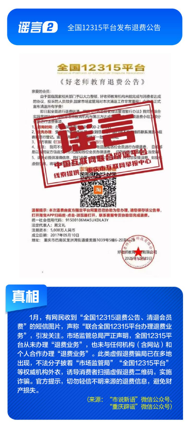 公共政策领域谣言误导公众决策。“社保卡没有有效期限制、未到期不能换新卡”是对社保卡管理政策的误读,给民众平添困扰;“28家博物馆元旦期间闭馆”实为少数博物馆根据运营安排所做的微调,网帖严重夸大实际闭馆情况,引发负面炒作;“深圳有望推行12年义务教育,高中免费”是对现行政策的“超前编造”,误导学生及家长群体;“全国12315平台发布退费公告”,则是假冒监管机构名义散播不实通知,为后续诈骗行为做铺垫。