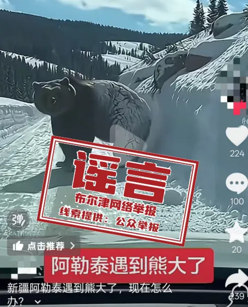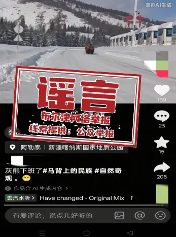 近日,有网民在社交平台发布视频,声称“新疆喀纳斯出现棕熊”“阿勒泰遇到熊大了”。经相关部门核查确认,视频为AI生成,并非真实拍摄画面,属地未发生此类“熊出没”事件,该消息属于不实谣言信息。